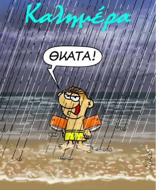 Ο Αρκάς μας καλημερίζει θυμωμένος. Σχεδίασε το αγαπημένο του αγοράκι, να φοράει τα μπρατσάκια του σε μια παραλία στα ρηχά, όπου έχει πιάσει βροχή με αποτέλεσμα να μην μπορεί να κολυμπήσει. Το σχόλιό του τα λέει όλα, «Θκατά». Δείτε το σκίτσο του Αρκά