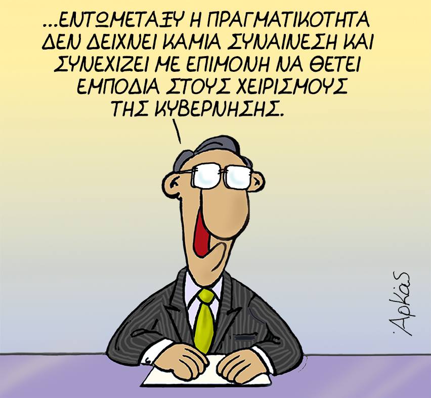 «…Εντωμεταξύ η πραγματικότητα δεν δείχνει καμία συναίνεση και συνεχίζει με επιμονή να θέτει εμπόδια στους χειρισμούς της κυβέρνησης» γράφει στο σκίτσο του ο Αρκάς.