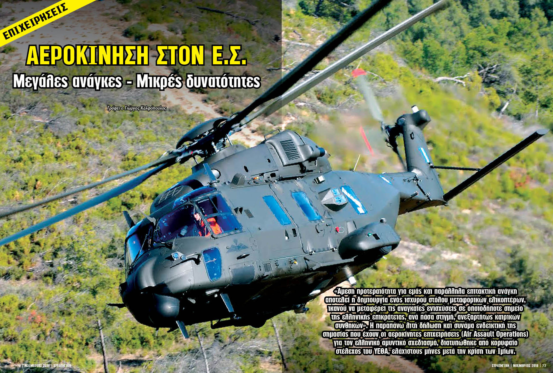 «Άμεση προτεραιότητα για εμάς και παράλληλα επιτακτική ανάγκη αποτελεί η δημιουργία ενός ισχυρού στόλου μεταφορικών ελικοπτέρων, ικανού να μεταφέρει τις αναγκαίες ενισχύσεις σε οποιοδήποτε σημείο της ελληνικής επικράτειας, ανά πάσα στιγμή, ανεξαρτήτως καιρικών συνθηκών». Η παραπάνω λιτή δήλωση και συνάμα ενδεικτική της σημασίας που έχουν οι αεροκίνητες επιχειρήσεις (Air Assault Operations) για τον ελληνικό αμυντικό σχεδιασμό, διατυπώθηκε από κορυφαίο στέλεχος του ΥΕΘΑ, ελάχιστους μήνες μετά την κρίση των Ιμίων.
