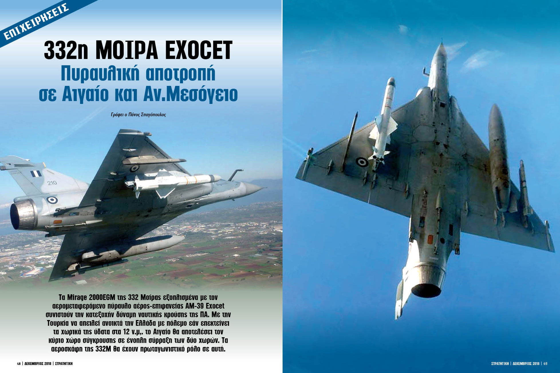 Τα Mirage 2000EGM της 332 Μοίρας εξοπλισμένα με τον αερομεταφερόμενο πύραυλο αέρος-επιφανείας ΑΜ-39 Exocet συνιστούν την κατεξοχήν δύναμη ναυτικής κρούσης της ΠΑ. Με την Τουρκία να απειλεί ανοικτά την Ελλάδα με πόλεμο εάν επεκτείνει τα χωρικά της ύδατα στα 12 ν.μ,. το Αιγαίο θα αποτελέσει τον κύριο χώρο σύγκρουσης σε ένοπλη σύρραξη των δύο χωρών. Τα αεροσκάφη της 332Μ θα έχουν πρωταγωνιστικό ρόλο σε αυτή.