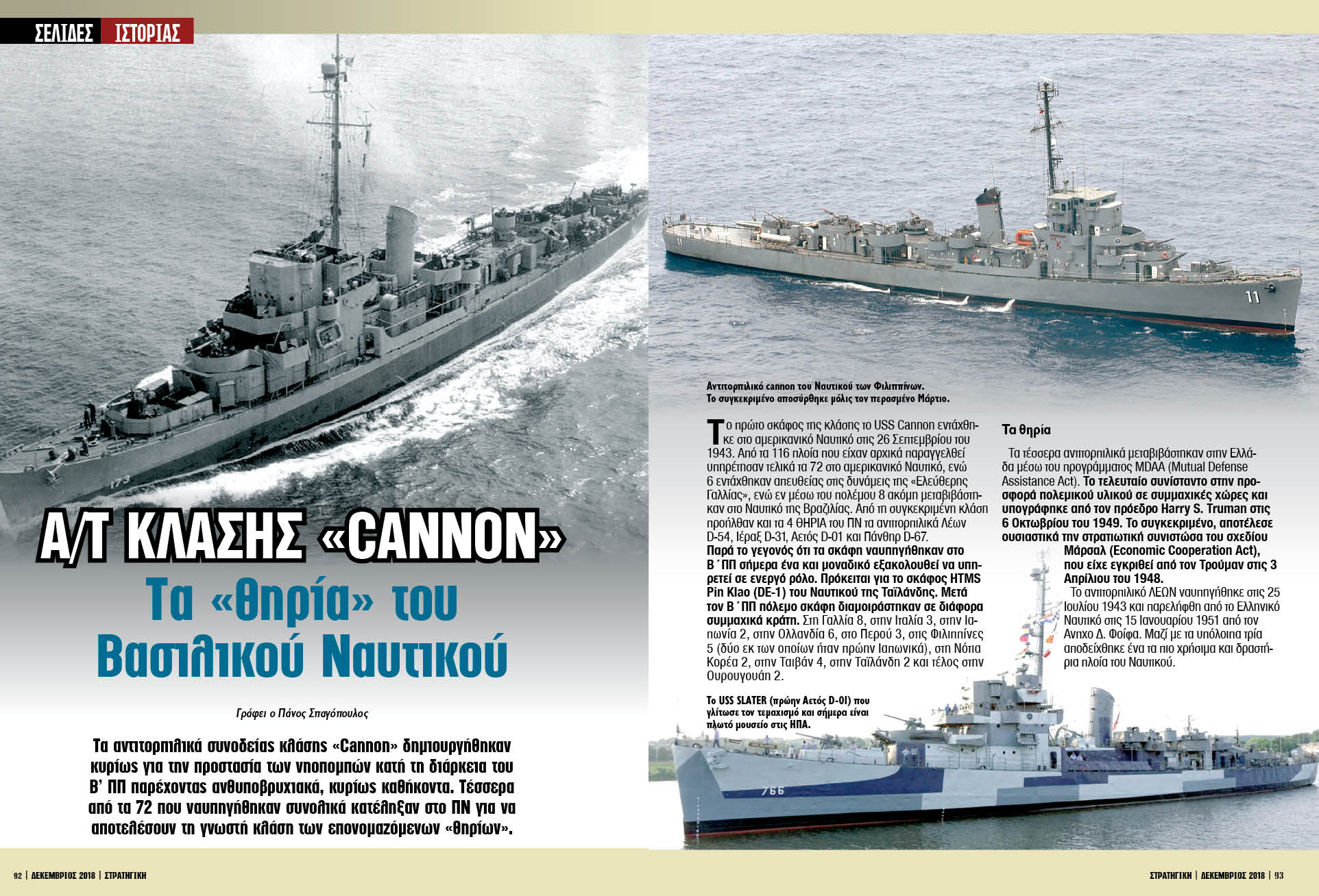Τα αντιτορπιλικά συνοδείας κλάσης «Cannon» δημιουργήθηκαν κυρίως για την προστασία των νηοπομπών κατή τη διάρκεια του Β’ ΠΠ παρέχοντας ανθυποβρυχιακά, κυρίως καθήκοντα. Τέσσερα από τα 72 που ναυπηγήθηκαν συνολικά κατέληξαν στο ΠΝ για να αποτελέσουν τη γνωστή κλάση των επονομαζόμενων «θηρίων».