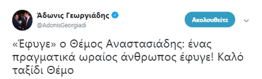 Ένας πραγματικά ωραίος άνθρωπος, ο Θέμος Αναστασιάδης, “έφυγε”, αναφέρει στο λιτό μήνυμά του ο αντιπρόεδρος της ΝΔ Άδωνις Γεωργιάδης στον προσωπικό λογαριασμό του στο Twitter.