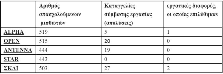 Τους περισσότερους εργαζόμενους από τα κανάλια πανελλήνιας εμβέλειας έχει ο ΑLPHA, τους λιγότερους το STAR, ενώ τα σκήπτρα στις καταγγελίες συμβάσεων εργασίας, έχει ο ΣΚΑΪ.