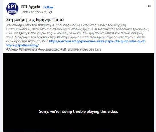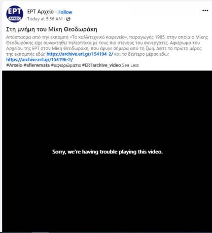Στη σελίδα του Αρχείου της ΕΡΤ στο Facebook δημοσιεύτηκαν το πρωί της Τετάρτης τρεις αναρτήσεις που αφορούσαν σε αφιερώματα στον σπουδαίο μουσικοσυνθέτη και την Ελληνίδα ηθοποιό. Μόνο που στις αναρτήσεις αναφερόταν ότι έφυγαν σήμερα από τη ζωή.