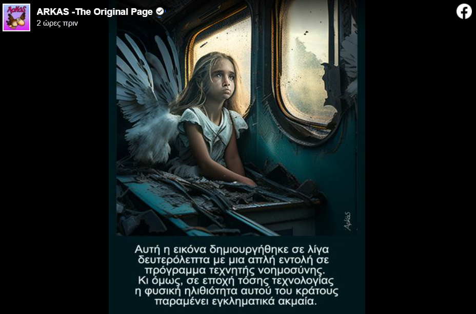 «Αυτή η εικόνα δημιουργήθηκε σε λίγα δευτερόλεπτα με μια απλή εντολή σε πρόγραμμα τεχνητής νοημοσύνης. Κι όμως, σε εποχή τόσης τεχνολογίας, η φυσική ηλιθιότητα αυτού του κράτους παραμένει εγκληματικά ακμαία», είναι το μήνυμα του Αρκά πάνω στην εικόνα.