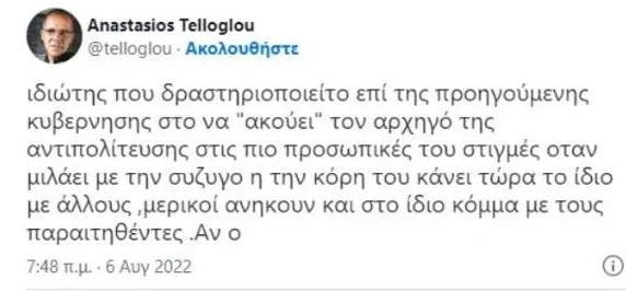 «Iδιώτης, που δραστηριοποιείτο επί της προηγούμενης κυβέρνησης στο να “ακούει” τον αρχηγό της αντιπολίτευσης στις πιο προσωπικές του στιγμές, όταν μιλάει με την σύζυγο η την κόρη του κάνει τώρα το ίδιο με άλλους, μερικοί ανήκουν και στο ίδιο κόμμα με τους παραιτηθέντες».