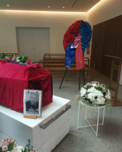 Το φέρετρο του δημοσιογράφου ήταν καλυμμένο από ένα κόκκινο πανί και πάνω του ήταν ένα κασκόλ και ένα στεφάνι από την αγαπημένη του ομάδα, τον Πανιώνιο.