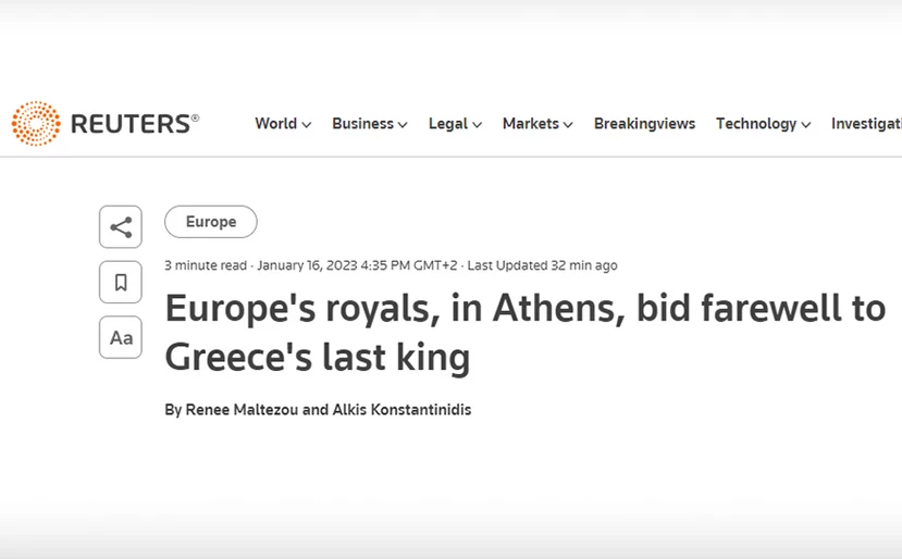 Αρχικά, το πρακτορείο reuters  ανέφερε σε άρθρο με τίτλο «οι βασιλικές οικογένειες της Ευρώπης, στην Αθήνα, αποχαιρέτησαν τον τελευταίο Βασιλιά της Ελλάδας», σημείωσε ότι «Ευρωπαίοι βασιλείς συγκεντρώθηκαν στην Αθήνα τη Δευτέρα για την κηδεία του Βασιλιά Κωνσταντίνου της Ελλάδας, ο οποίος κυβέρνησε μόλις τρία χρόνια τη δεκαετία του 1960 προτού εξαναγκαστεί σε εξορία, με τον λαό του να ψηφίζει για την κατάργηση της μοναρχίας το 1974».