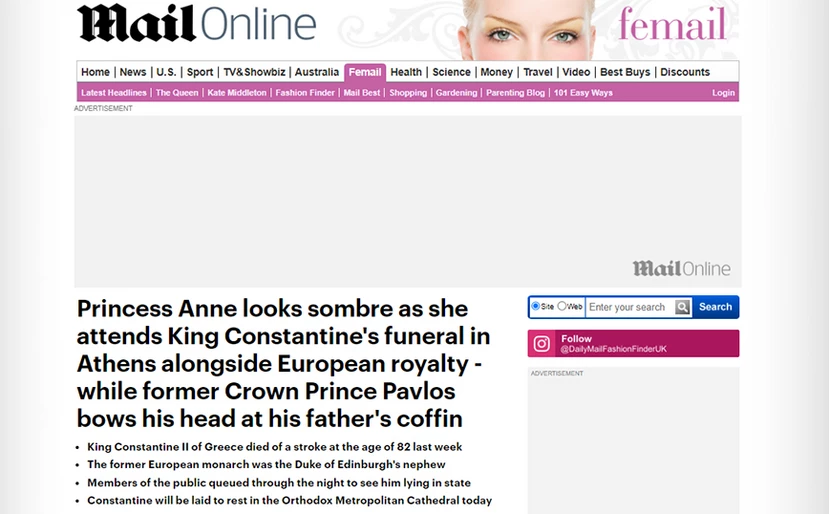 Μάλιστα, η dailymail  σημειώνει ότι «η πριγκίπισσα Άννα δείχνει μελαγχολική καθώς παρευρίσκεται στην κηδεία του βασιλιά Κωνσταντίνου στην Αθήνα μαζί με τους Ευρωπαίους βασιλείς – ενώ ο πρώην διάδοχος του θρόνου Παύλος σκύβει το κεφάλι στο φέρετρο του πατέρα του».