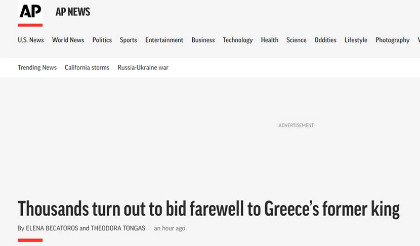 Επίσης, το apnews  σε τίτλο με άρθρο «χιλιάδες προσέρχονται για να αποχαιρετήσουν τον πρώην Βασιλιά της Ελλάδας», αναφέρει πως «καθώς ένα πλήθος χιλιάδων φώναζε «ζήτω ο Βασιλιάς» και “Κωνσταντίνε, Κωνσταντίνε”, το φέρετρο που μετέφερε τον πρώην και τελευταίο μονάρχη της Ελλάδας βγήκε από τον μητροπολιτικό καθεδρικό ναό της Αθήνας τη Δευτέρα μετά την κηδεία στην οποία συμμετείχαν βασιλείς από όλη την Ευρώπη».