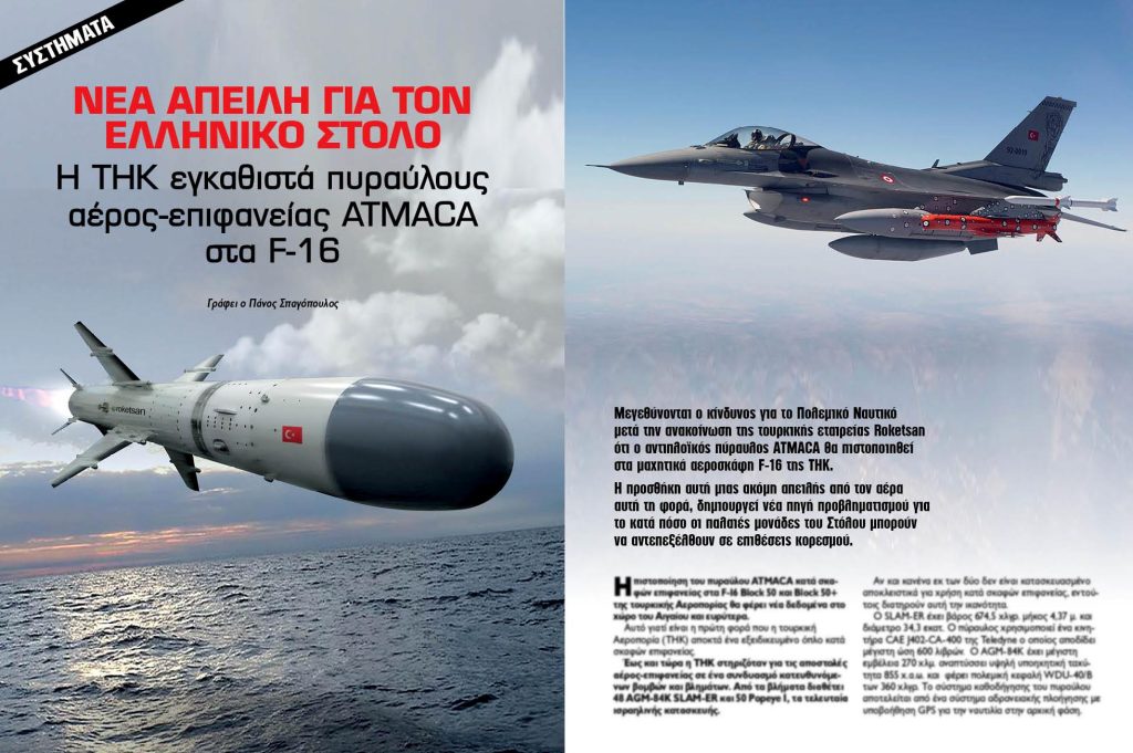Νέα απειλή για τον ελληνικό Στόλο: Η ΤΗΚ εγκαθιστά πυραύλους αέρος-επιφανείας ATMACA στα F-16