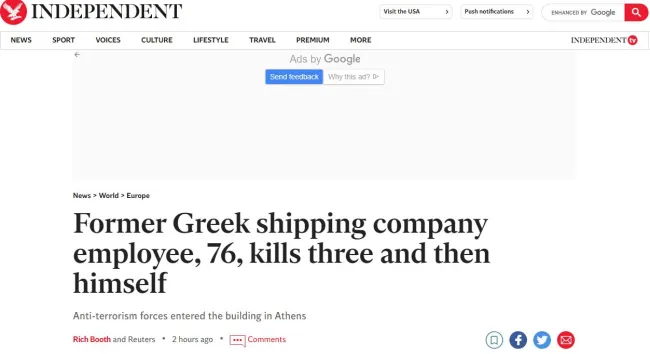 Αντίστοιχα, η βρετανική «Independent», μεταδίδοντας την είδηση, προσδιορίζει ως δράστη της επίθεσης στη Γλυφάδα με τους τέσσερις νεκρούς, έναν 76χρονο πρώην εργαζόμενο της ναυτιλιακής εταιρείας.