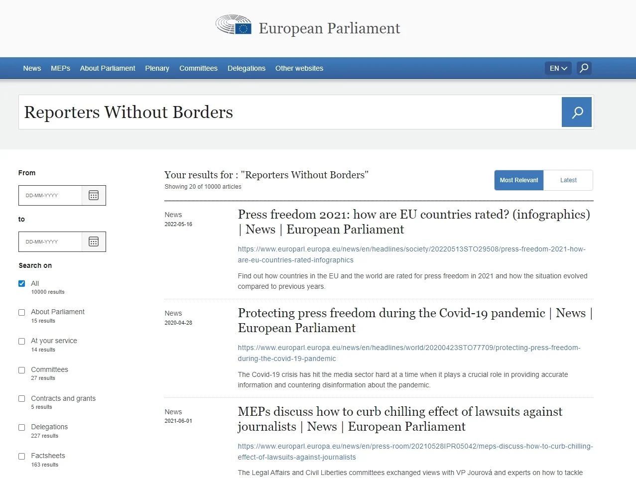 Η έκθεση των Ρεπόρτερ Χωρίς Σύνορα δημοσιεύθηκε στην ιστοσελίδα του ευρωκοινοβουλίου στις 16 Μαΐου, ωστόσο όποιος την αναζητήσει σήμερα θα δει ότι τον παραπέμπει σε.. error.