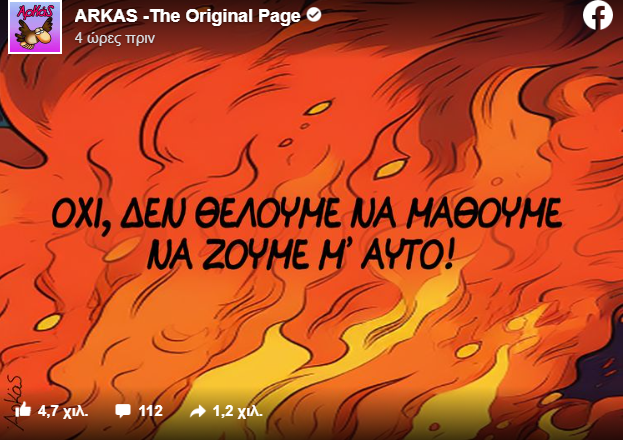 Ο Αρκάς δημοσίευσε νέο σκίτσο το πρωί της Τρίτης (22/8) στη σελίδα του στο Facebook για τις φωτιές που μαίνονται στη χώρα μας.