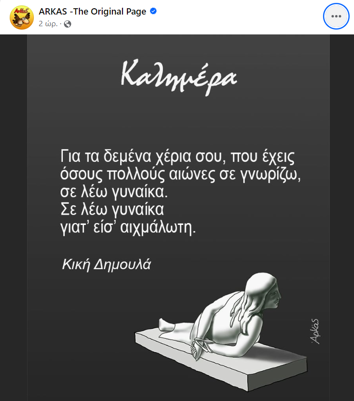 Ένα σκίτσο στίχους της Κικής Δημουλά δημοσίευσε ο Αρκάς για την Παγκόσμια Ημέρα της Γυναίκας.
