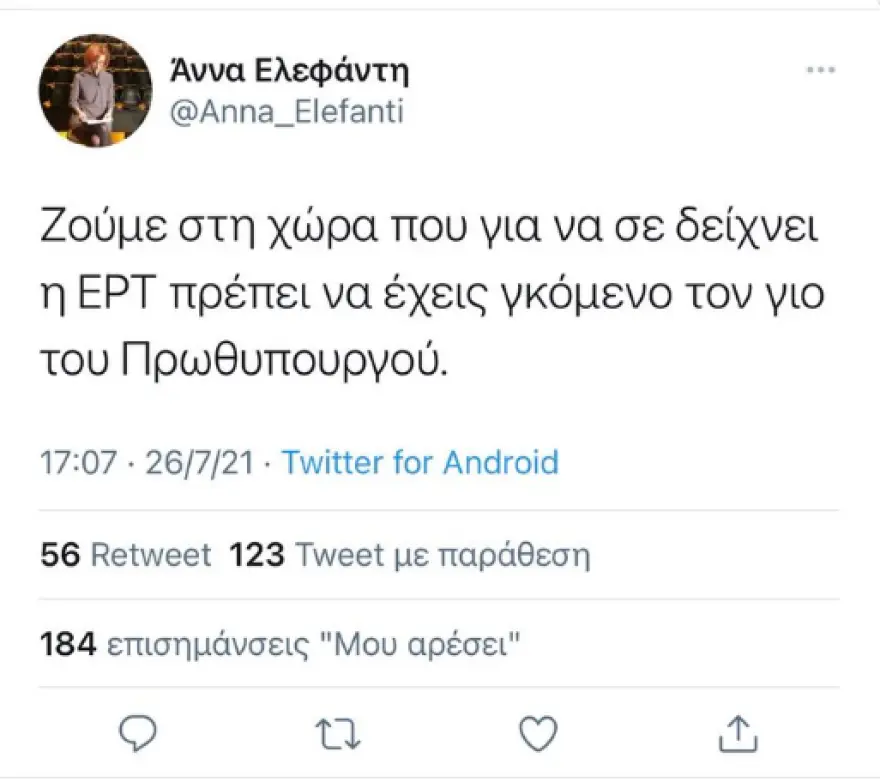 Στελέχη της Νέας Δημοκρατίας κάνουν λόγο για πόλεμο λάσπης του ΣΥΡΙΖΑ κατά της οικογένειας του πρωθυπουργού με στόχο τον ίδιο, ενώ ο Κωνσταντίνος Μητσοτάκης που βρίσκεται σε σχέση με την Μαρία Σάκκαρη μιλά για ρητορική μίσους και σεξιστική- χυδαία επίθεση, σε μια περίοδο μάλιστα όπου η Ελληνίδα τενίστρια αγωνίζεται στους Ολυμπιακούς αγώνες. Νωρίτερα η Άννα Ελεφάντη παίρνοντας αφορμή από την διαμαρτυρία Πετρούνια για το γεγονός ότι η ΕΡΤ δεν μετέδωσε «ζωντανά» την προσπάθειά του στον προκριματικό των κρίκων, είχε τουϊτάρει το εξής: «Ζούμε στη χώρα που για να σε δείχνει η ΕΡΤ πρέπει να έχεις γκόμενο τον γιο του πρωθυπουργού!».