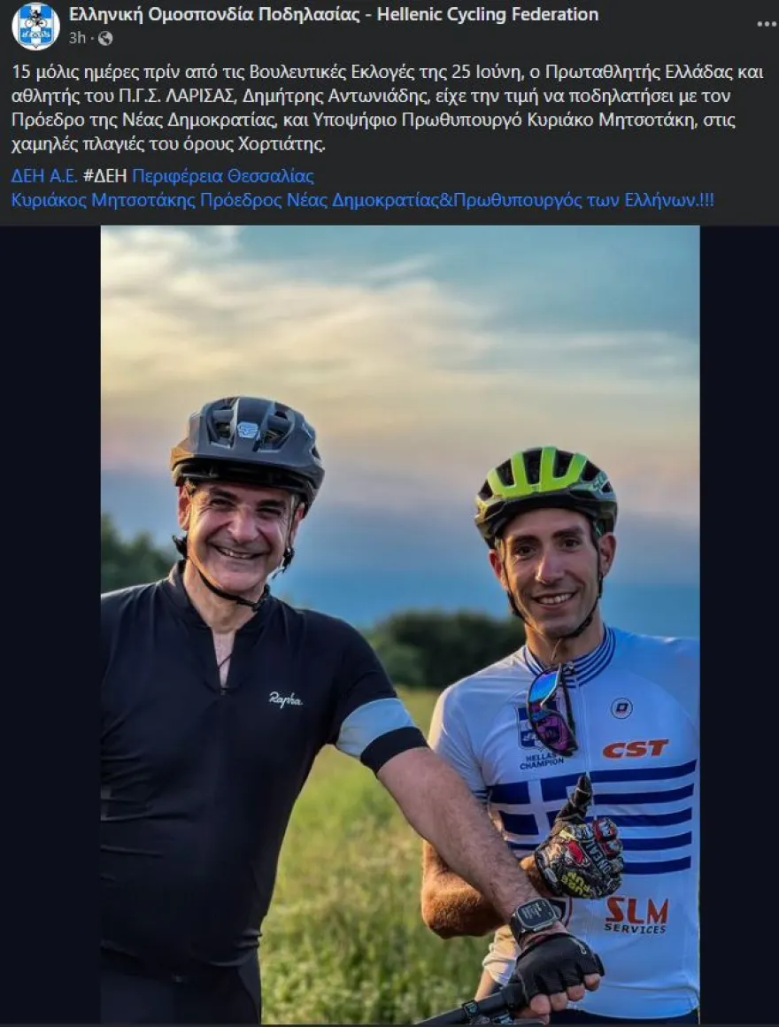 Συγκεκριμένα η ανάρτηση αναφέρει: «15 μόλις ημέρες πριν από τις Βουλευτικές Εκλογές της 25 Ιούνη, ο Πρωταθλητής Ελλάδας και αθλητής του Π.Γ.Σ. ΛΑΡΙΣΑΣ, Δημήτρης Αντωνιάδης, είχε την τιμή να ποδηλατήσει με τον Πρόεδρο της Νέας Δημοκρατίας, και Υποψήφιο Πρωθυπουργό Κυριάκο Μητσοτάκη, στις χαμηλές πλαγιές του όρους Χορτιάτης».