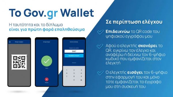 Η επαλήθευση γνησιότητας κάθε ψηφιακού αντιγράφου γίνεται με τον κωδικό QR του. Μόλις κάποιος σκανάρει τον κωδικό QR ενός πολίτη μέσω της ίδιας εφαρμογής Gov.gr Wallet, ο τελευταίος λαμβάνει ειδοποίηση από την εφαρμογή, προκειμένου να δώσει έγκριση στον ελεγκτή προκειμένου να επαληθεύσει τα στοιχεία του. Αφού ο πολίτης εγκρίνει τον έλεγχο, στην οθόνη της εφαρμογής εμφανίζεται ένας εξαψήφιος κωδικός τον οποίο πρέπει να υπαγορεύσει ή να επιδείξει στον ελεγκτή και εκείνος με τη σειρά του να τον καταχωρίσει στη δική του συσκευή. Αφού ολοκληρωθεί η διαδικασία, τότε και μόνο τότε τα στοιχεία του ψηφιακού αντιγράφου εμφανίζονται για μία και μόνο φορά στη συσκευή του ελεγκτή, χωρίς τη δυνατότητα αποθήκευσης.