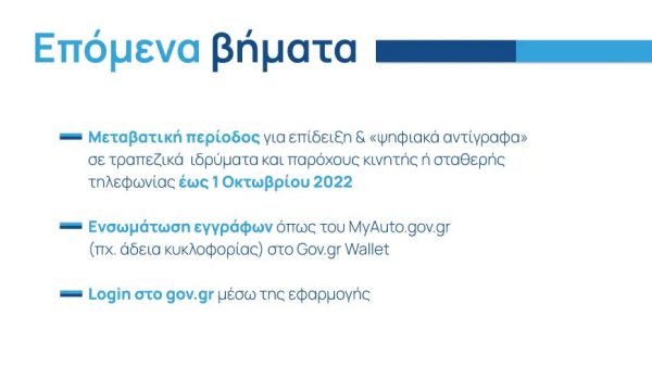 Στο μέλλον πρόκειται να προστεθούν στην εφαρμογή περισσότερα έγγραφα, όπως τα στοιχεία της άδειας κυκλοφορίας, τα στοιχεία για την πληρωμή των τελών κυκλοφορίας, το αποτέλεσμα του Τεχνικού Ελέγχου Οχημάτων (ΚΤΕΟ) και η ημερομηνία του επόμενου ελέγχου, τα στοιχεία ασφάλισης κλπ. Περαιτέρω, μελλοντικά θα είναι δυνατή και η αυθεντικοποίηση στο gov.gr μέσω του Gov.gr Wallet.