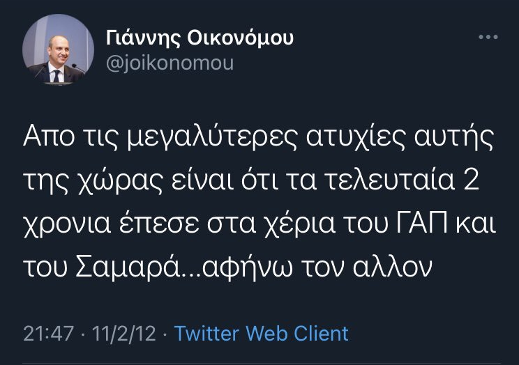 Δείτε τι έγραφε στο twitter πριν λίγα χρόνια ο κ. Οικονόμου, ο οποίος επιτιθόταν στον Αντώνη Σαμαρά επειδή αρχικά ήταν εναντίον του μνημονίου!