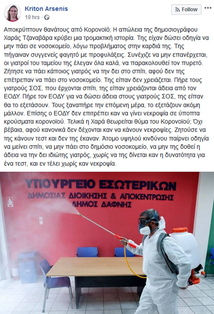 Είχε προηγηθεί η ανάρτηση του βουλευτή του ΜέΡΑ25,στην οποία ανέφερε: «Αποκρύπτουν θανάτους από Κορονοϊό; Η απώλεια της δημοσιογράφου Χαράς Τζαναβάρα κρύβει μια τρομακτική ιστορία. Της είχαν δώσει οδηγία να μην πάει σε νοσοκομείο, λόγω προβλήματος στην καρδιά της. Της πήγαιναν συγγενείς φαγητό με προφυλάξεις. Συνέχιζε να μην επανέρχεται, οι γιατροί του ταμείου της έλεγαν όλα καλά, να παρακολουθεί τον πυρετό. Ζήτησε να πάει κάποιος γιατρός να την δει στο σπίτι, αφού δεν της επέτρεπαν να πάει στο νοσοκομείο. Της είπαν δεν χρειάζεται. Πήρε τους γιατρούς ΣΟΣ, που έρχονται σπίτι, της είπαν χρειάζονται άδεια από τον ΕΟΔΥ. Πήρε τον ΕΟΔΥ για να δώσει άδεια στους γιατρούς ΣΟΣ, της είπαν θα το εξετάσουν. Τους ξαναπήρε την επόμενη μέρα, το εξετάζουν ακόμη μάλλον. Επίσης ο ΕΟΔΥ δεν επιτρέπει καν να γίνει νεκροψία σε ύποπτα κρούσματα κορονοϊού. Τελικά η Χαρά θεωρείται θύμα του Κορονοϊού; Όχι βέβαια, αφού κανονικά δεν δέχονται καν να κάνουν νεκροψίες. Ζητούσε να της κάνουν τεστ και δεν της έκαναν. Άτομο υψηλού κινδύνου παίρνει οδηγία να μείνει σπίτι, να μην πάει στο δημόσιο νοσοκομείο, να μην της δοθεί η άδεια να την δει ιδιώτης γιατρός, χωρίς να της δίνεται καν η δυνατότητα για ένα τεστ, και εν τέλει χωρίς καν νεκροψία».
