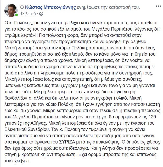 «Ο κ. Πολάκης, με τον γνωστό μειλίχιο και ευγενικό τρόπο του, μας επιτίθεται για το κόστος του αστικού εξοπλισμού, του Μεγάλου Περιπάτου, λέγοντας ότι «τρώμε λεφτά»!! Για πολλοστή φορά, δεν μπορεί να αντισταθεί στον πειρασμό να αγνοήσει την πραγματικότητα και να αρνηθεί την αλήθεια. Μικρή λεπτομέρεια για τον κύριο Πολάκη, και τους συν αυτώ, ότι όταν ένας δήμος προμηθεύεται αστικό εξοπλισμό, δεν το κάνει μόνο για τη θητεία του δημάρχου αλλά για πολλά χρόνια. Μικρή λεπτομέρεια, ότι δεν νοείται να σπαταλάμε δημόσιο χρήμα επενδύοντας σε προμήθειες τις οποίες πετάμε μετά από λίγο ή πληρώνουμε πολύ περισσότερα για την συντήρησή τους. Μικρή λεπτομέρεια ίσως και απογοητευτική, ότι μιλάμε για σύνθετες, μεταλλικές κατασκευές που ζυγίζουν μέχρι και έναν τόνο για να μη γίνονται πολεμοφόδια. Μικρή λεπτομέρεια, ότι έχουν σχεδιαστεί για να μη βανδαλίζονται αλλά και ότι καλύπτονται με αντιγκράφιτι υλικό. Μικρή λεπτομέρεια για τον κύριο Πολάκη, ότι έχουν εγγύηση από τον κατασκευαστή έως και 15 χρόνια. Μικρή λεπτομέρεια ότι όταν τελειώσει η πιλοτική περίοδος του Μεγάλου Περιπάτου και γίνουν μόνιμα τα έργα, θα ομορφύνουν τις 129 γειτονιές της Αθήνας. Μικρή λεπτομέρεια ότι όλα έγιναν με την έγκριση του Ελεγκτικού Συνεδρίου. Τον κ. Πολάκη τον τυφλώνει η ανάγκη να κάνει αντιπερισπασμό για να αποπροσανατολίσει την συζήτηση από όσα έγιναν στα κομματικά όργανα του ΣΥΡΙΖΑ μετά τις αποκαλύψεις. Ο δημόσιος χώρος δεν έχει όμως ούτε χρώμα ούτε ιδεολογια. Και η Αθήνα δεν προσφέρεται για φτηνή μικροπολιτική αντιπαράθεση. Έχει δρόμο μπροστά της και επιτέλους, τον έχει βρει».