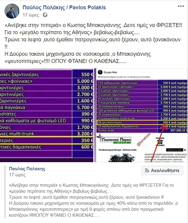 Συγκεκριμένα, με ανάρτησή του στο facebook, ο πρώην υπουργός του ΣΥΡΙΖΑ υποστηρίζει ότι «τρώνε τα λεφτά ,αυτό έμαθαν πατρογονικώς, αυτό ξέρουν, αυτό ξανακάνουν !!», δημοσιεύοντας παράλληλα σχετικό πίνακα με το κόστος: ««Ανέβηκε στην πιπεριά» ο Κωστας Μπακογιάννης .Δειτε τιμές να ΦΡΙΞΕΤΕ!! Για το «μεγάλο περίπατο της Αθήνας» βεβαίως-βεβαίως….