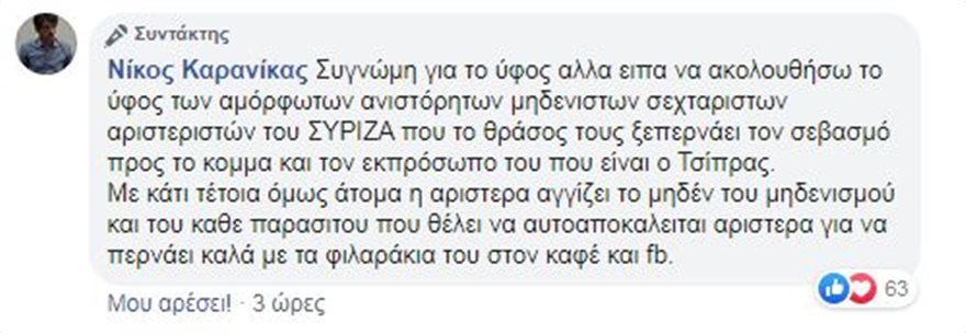 Η ανάρτηση έλαβε πλήθος σχολίων και ο Νίκος Καρανίκας δεν σταμάτησε εκεί, αφου ακόμα και από τα σχόλια συνεχίζει ανένδοτος την επίθεση στους «αμόρφωτους, ανιστόρητους, μηδενιστές, σεχταριστές, αριστεριστές του ΣΥΡΙΖΑ».