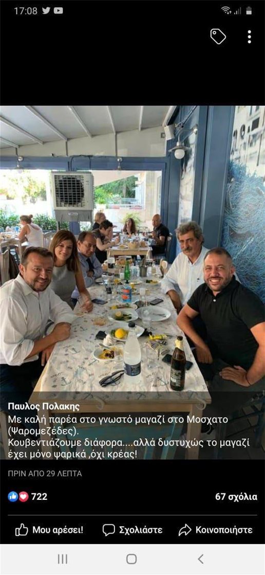 Με χαλαρή διάθεση εμφανίστηκε ο πρώην αναπληρωτής υπουργός Υγείας, Παύλος Πολάκης ο οποίος μαζί με τους Νίκο Παππά, Κατερίνα Νοτοπούλου και Χρήστο Σπίρτζη έφαγαν τα ψαράκια τους στο Μοσχάτο.