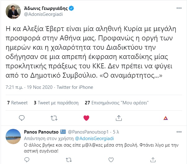 Η κα Αλεξία Έβερτ είναι μία αληθινή Κυρία με μεγάλη προσφορά στην Αθήνα μας. Προφανώς η οργή των ημερών και η χαλαρότητα του Διαδικτύου την οδήγησαν σε μια απρεπή έκφραση καταδίκης μίας προκλητικής πράξεως του ΚΚΕ. Δεν πρέπει να φύγει από το Δημοτικό Συμβούλιο. «Ο αναμάρτητος…»