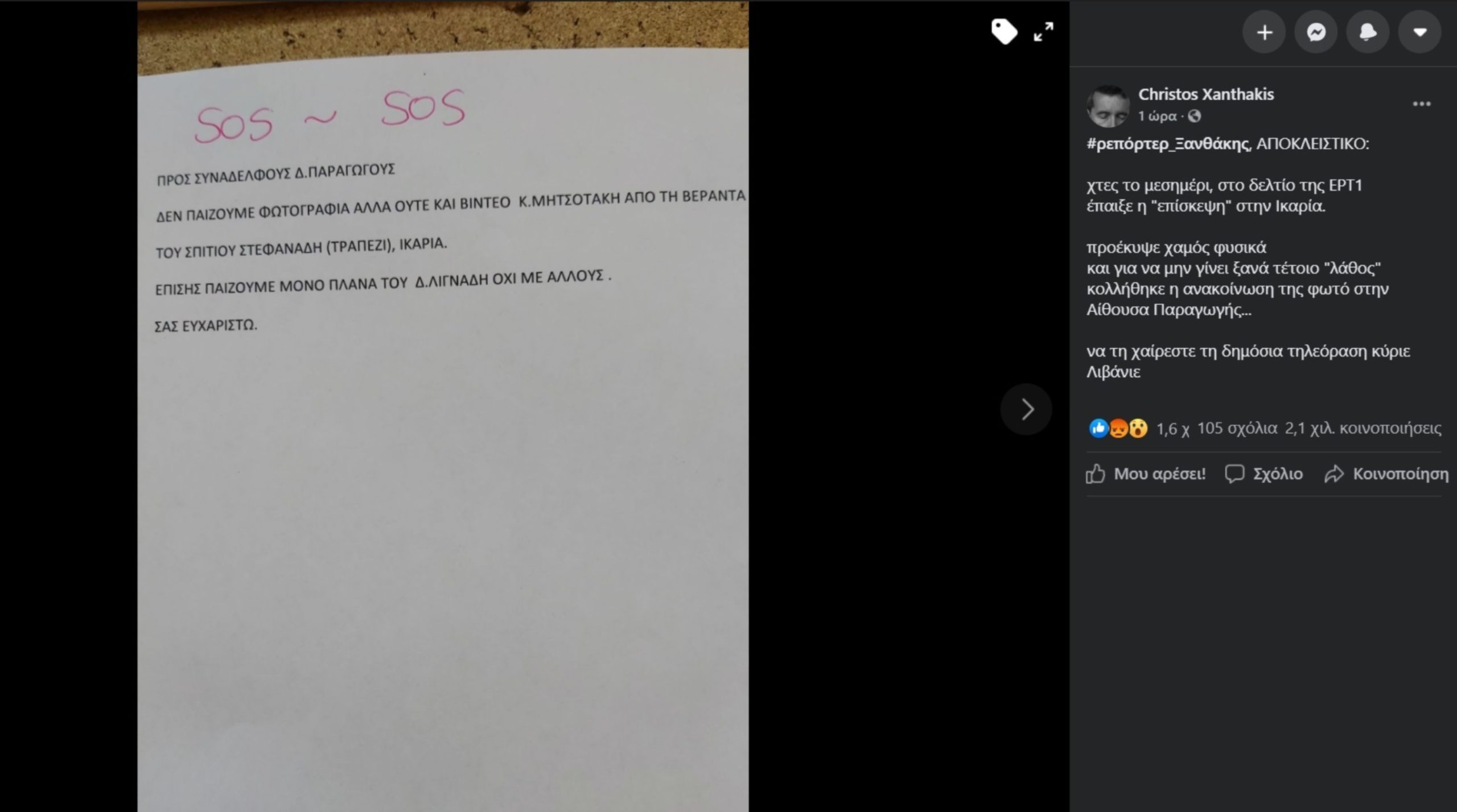 Το γύρο του διαδικτύου κάνει φωτογραφία η οποία φέρεται να είναι από την ΕΡΤ στην αίθουσα παραγωγής όπου δίνεται «γραμμή» στους υπαλλήλους να μην παίξουν βίντεο η φωτογραφίες του πρωθυπουργικού γεύματος στην Ικαρία.