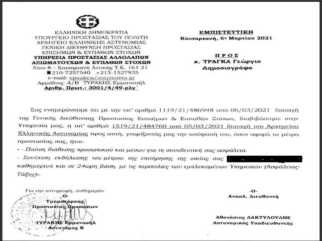 Αξίζει να σημειωθεί ότι η Ελληνική Αστυνομία έχει κοινοποιήσει απόρρητο έγγραφο επί εποχής ΣΥΡΙΖΑ στον Γιώργο Τράγκα ότι συντρέχουν στο πρόσωπο του ιδιαίτερα μέτρα ασφαλείας.