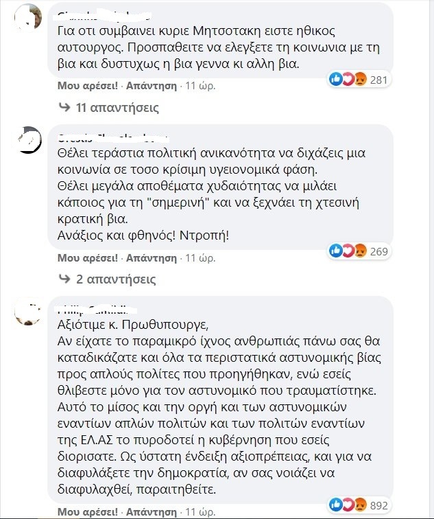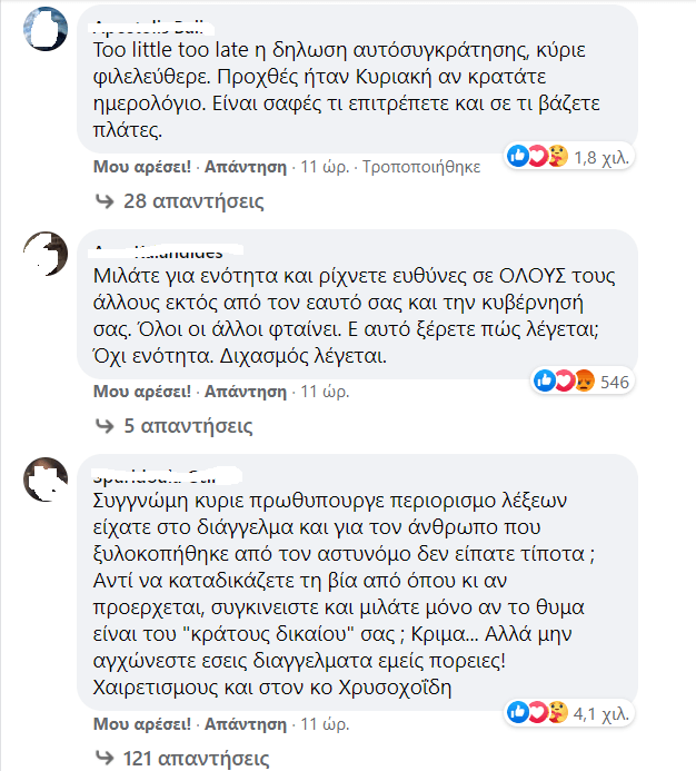 Λίγη ώρα αργότερα ο πρωθυπουργός Κ.Μητσοτάκης εμφανίστηκε, μέσω διαγγέλματος, μιλώντας για «διχασμό», όμως όπως βλέπουμε στα χιλιάδες σχόλια που υπήρξαν στο Facebook του οι πολίτες έχουν άλλη άποψη.