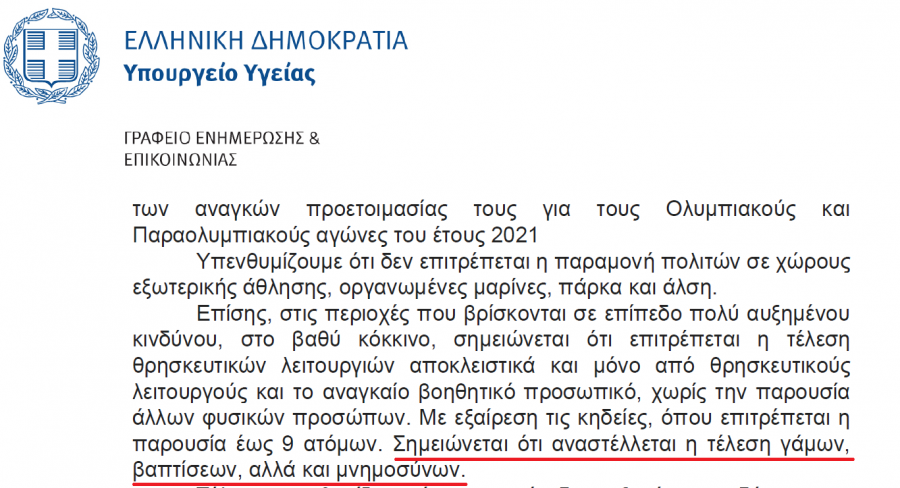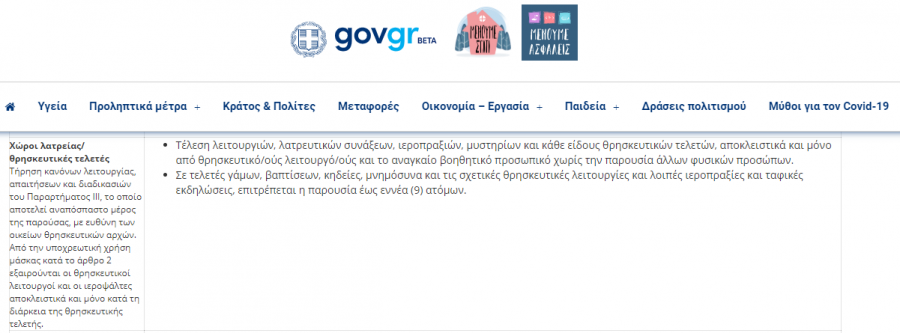 Σημειώνεται εδώ πως στην κυβέρνηση και τις αρμόδιες αρχές επικρατεί το απόλυτο επιτελικό χάος. Στην επίσημη κυβερνητική σελίδα για τα μέτρα αντιμετώπισης του κορωνοϊού ανά περιφέρεια, αναγράφεται πως «σε τελετές γάμων, βαπτίσεων, κηδείες, μνημόσυνα και τις σχετικές θρησκευτικές λειτουργίες και λοιπές ιεροπραξίες και ταφικές εκδηλώσεις, επιτρέπεται η παρουσία έως εννέα (9) ατόμων».