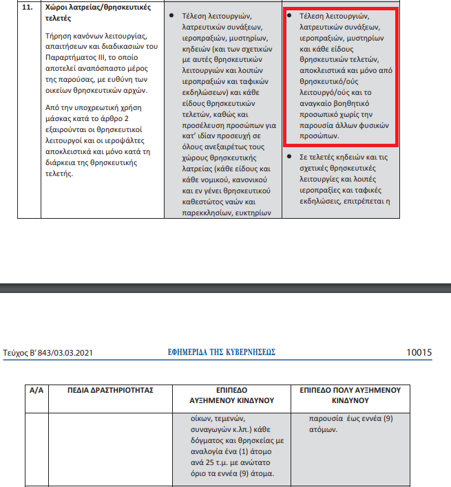 Ωστόσο, ενόσω η Αττική βρίσκεται στο επίπεδο του «πολύ αυξημένου κινδύνου», οι θρησκευτικές λειτουργίες επιτρέπονται μόνο με την παρουσία κληρικού και βοηθητικού προσωπικού του. Αυτό φαίνεται και από τα όσα το ΦΕΚ με αριθμό φύλλου 843, Τεύχος Β, της 3ης Μαρτίου που έχει ισχύ μέχρι και 15 Μαρτίου.