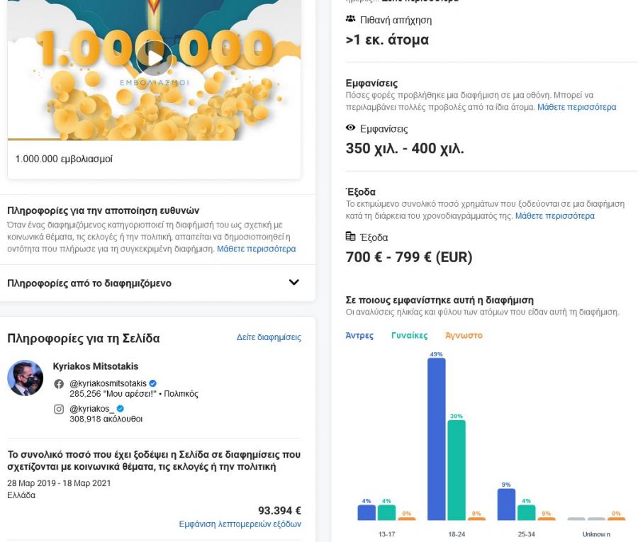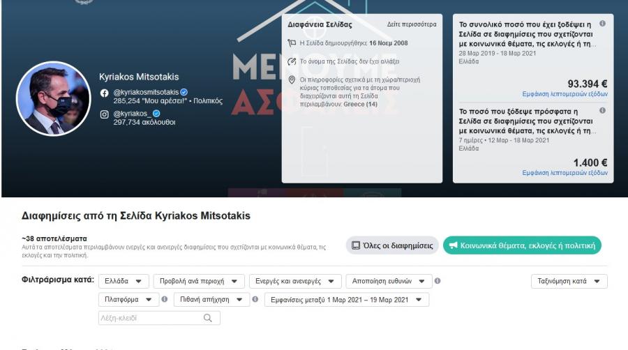 Εντός του Μαρτίου, η σελίδα του Κυριάκου Μητσοτάκη έχει προωθήσει 38 (!) χορηγούμενες καταχωρήσεις – διαφημίσεις, για θέματα όπως:
