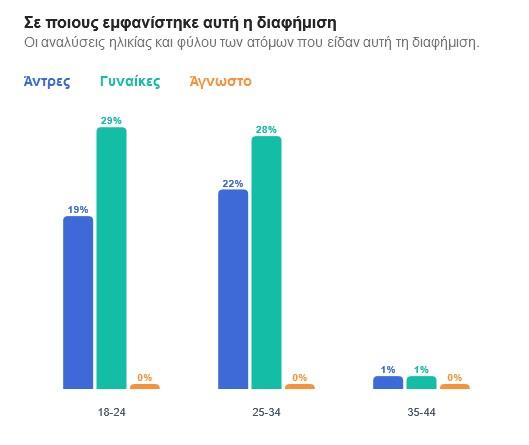 Αντίστοιχα, οι 6 χορηγούμενες καταχωρήσεις για τα δικαιώματα των ΛΟΑΤΚΙ+, προβλήθηκαν σχεδόν αποκλειστικά (92%) σε άτομα κάτω των 45 ετών.