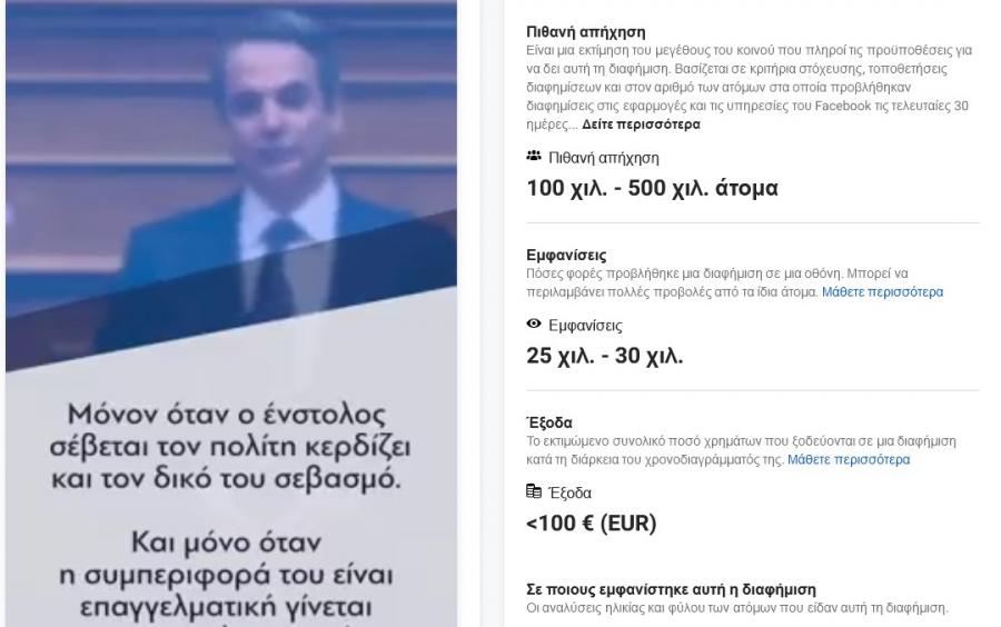 Εντός του Μαρτίου, η σελίδα του Κυριάκου Μητσοτάκη έχει προωθήσει 38 (!) χορηγούμενες καταχωρήσεις – διαφημίσεις, για θέματα όπως: