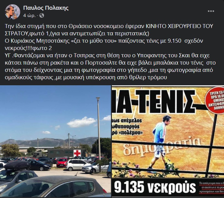 Και σκέφτεται -όπως προφανώς σκέφτονται πολλοί Έλληνες- τι θα γινόταν αν στη θέση του ήταν πρωθυπουργός ο Αλέξης Τσίπρας και έπαζε τένις ενώ οι νεκροί από την πανδημία έφτασαν τις 9.100.