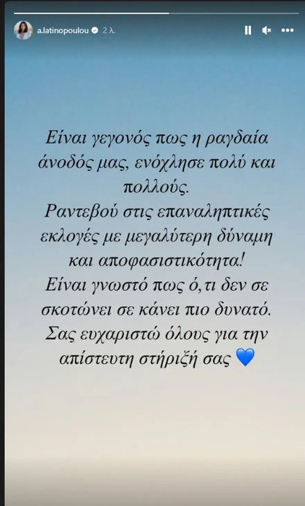 Η πρώτη αντίδραση της Λατινοπούλου μετά το «κόψιμο» του κόμματός της από τις εκλογές, ήρθε μέσω ανάρτησης στο Instagram, στην οποία έδωσε ραντεβού για τις επαναληπτικές εκλογές.