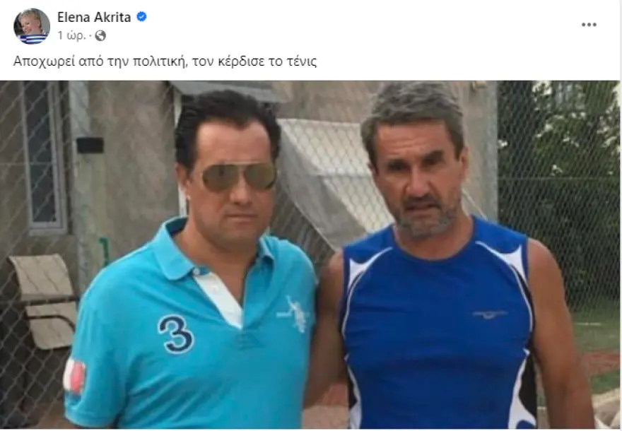 H βουλευτής του ΣΥΡΙΖΑ, Έλενα Ακρίτα, σχολίασε την αποχώρηση του Ανδρέα Λοβέρδου από το ΠΑΣΟΚ με μια φωτογραφία του από τότε που έπαιζε τένις με τον Άδωνι Γεωργιάδη.