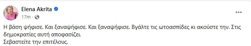 Η Έλενα Ακρίτα καλεί σε ανάρτησή της να σεβαστούν τη βάση του ΣΥΡΙΖΑ που έχει ψηφίσει πολλές φορές ως τώρα.