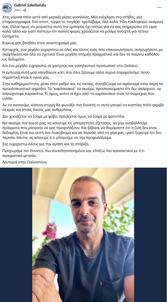 Ο Γαβριήλ Σακελλαρίδης, το πρωί της Τρίτης (16/9) έκανε την πρώτη του ανάρτηση μετά τη σοβαρή περιπέτεια υγείας που είχε, όπου νοσηλεύτηκε στο Ωνάσειο μετά την επέμβαση για τοποθέτηση στεντ.