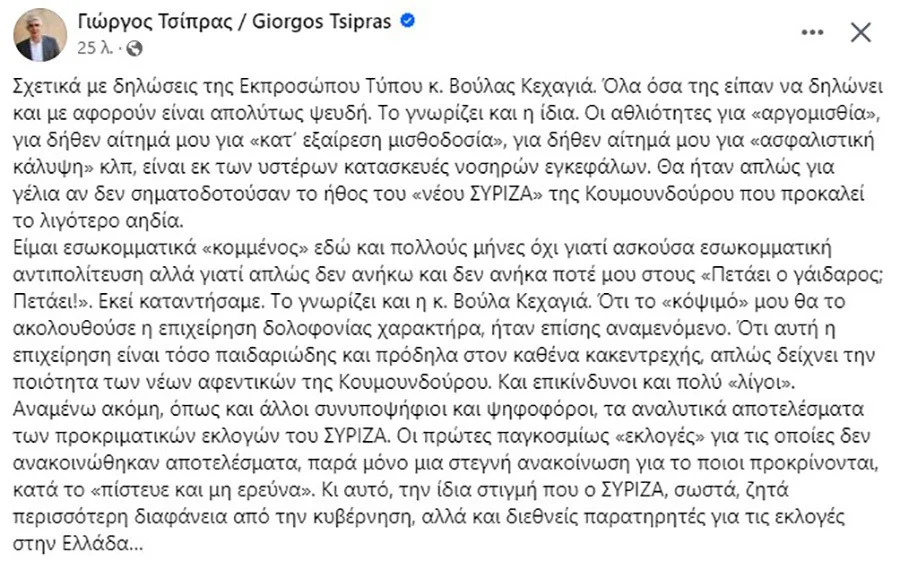 «Σχετικά με δηλώσεις της Εκπροσώπου Τύπου κ. Βούλας Κεχαγιά. Όλα όσα της είπαν να δηλώνει και με αφορούν είναι απολύτως ψευδή. Το γνωρίζει και η ίδια.