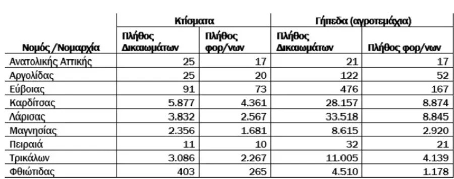 Με βάση τις αιτήσεις απαλλαγής που υποβλήθηκαν στην πλατφόρμα Αρωγή (arogi.gov.gr), η ΑΑΔΕ προχώρησε συνολικά σε απαλλαγές από τον ΕΝΦΙΑ 2024 σε 11.230 ΑΦΜ, για 15.706 δικαιώματα ιδιοκτησίας επί κτιρίων μετά του αναλογούντος οικοπέδου και σε 25.432 ΑΦΜ για 86.456 δικαιώματα ιδιοκτησίας επί αγροτεμαχίων.