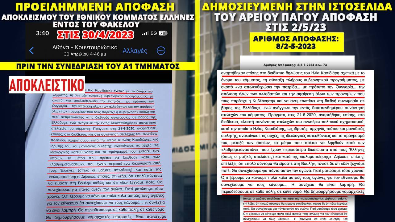 Η απόφαση είχε γραφτεί πολύ πριν την συνεδρίαση του Α1 του Αρείου Πάγου και την ξέχασαν μέσα στον φάκελο της δικογραφίας! Η συνέχεια στο Α.Ε.Δ. και το Ευρωπαϊκό Δικαστήριο.… pic.twitter.com/sBLoarDGOO— Ηλίας Κασιδιάρης (@IliasKasidiaris) May 10, 2023