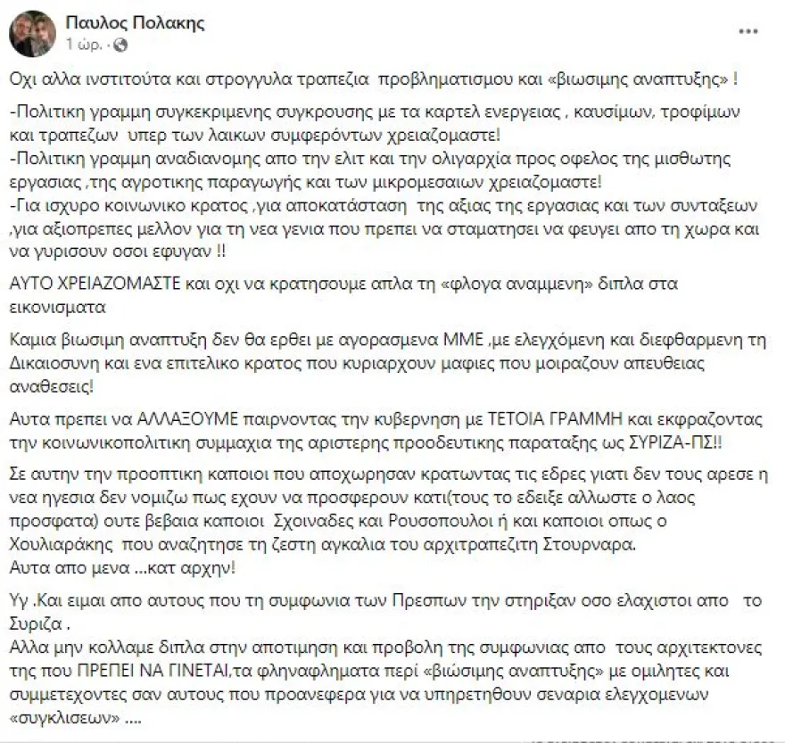 Με αφορμή, δε, τη συζήτηση που γίνεται για την μεγάλη κεντροαριστερά, ο Παύλος Πολάκης κλείνει την ανάρτησή του γράφοντας «μην κολλάμε δίπλα στην αποτίμηση και προβολή της συμφωνίας (σ.σ. των Πρεσπών) από τους αρχιτέκτονες της που ΠΡΕΠΕΙ ΝΑ ΓΙΝΕΤΑΙ, τα φληναφήματα περί «βιώσιμης ανάπτυξης» με ομιλητές και συμμετέχοντες σαν αυτούς που προανάφερα για να υπηρετηθούν σενάρια ελεγχόμενων “συγκλείσεων”».