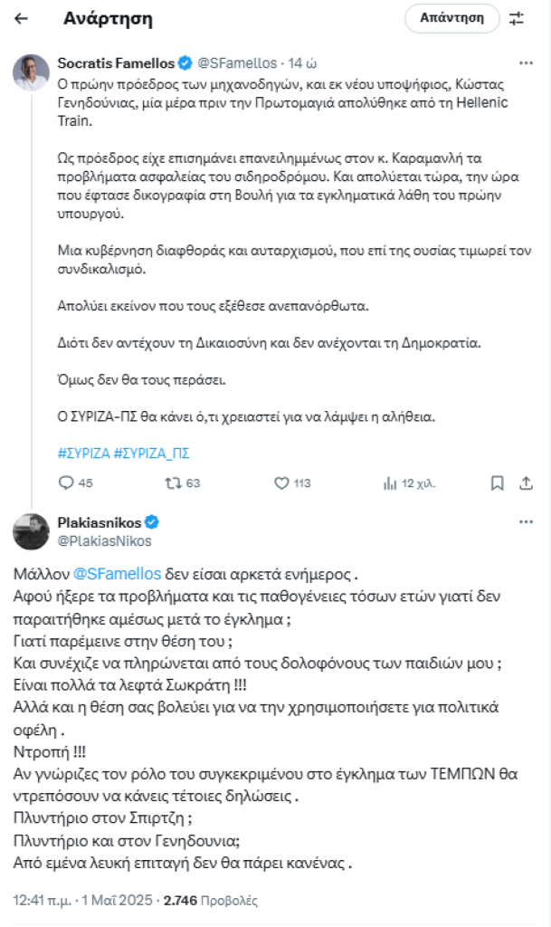 Με μια ανάρτηση στο X (πρώην Twitter), ο Κώστας Πλακιάς, πατέρας δύο θυμάτων της τραγωδίας των Τεμπών, απάντησε με σκληρή γλώσσα στον πρόεδρο του ΣΥΡΙΖΑ, Σωκράτη Φάμελλο, κατηγορώντας τον για πολιτική σκοπιμότητα με αφορμή την απόλυση του Κώστα Γενηδούνια από τη Hellenic Train.