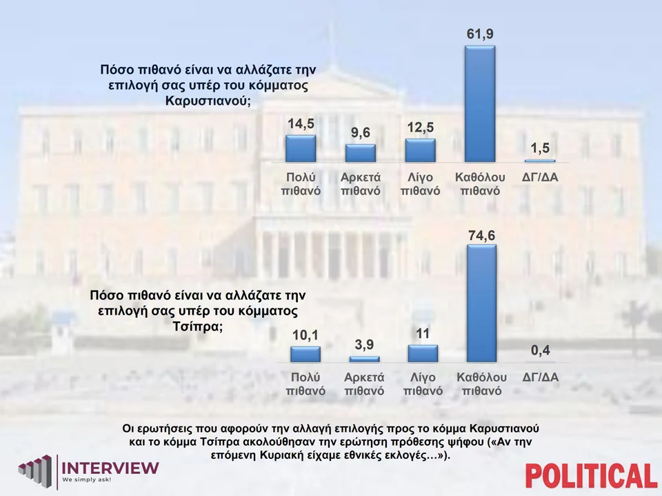 Στην ερώτηση «Πόσο πιθανό είναι να αλλάζατε την επιλογή σας υπέρ του κόμματος Καρυστιανού, αν την επόμενη Κυριακή είχαμε εθνικές εκλογές;», κυριάρχησε το «καθόλου πιθανό» με ποσοστό 61,9%, ενώ στην ίδια ερώτηση για το κόμμα του Αλέξη Τσίπρα, το «καθόλου πιθανό» λαμβάνει ποσοστό 74,6%.