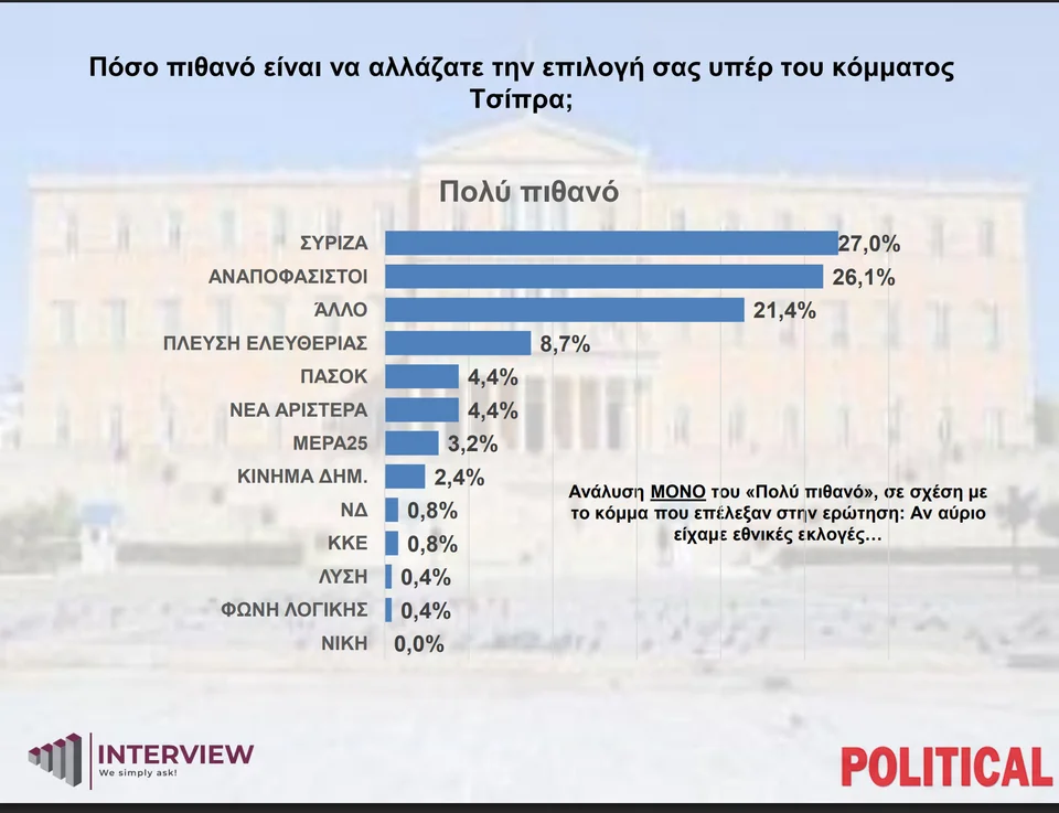 Όσον αφορά τους ψηφοφόρους που επέλεξαν «πολύ πιθανό» να ψηφίσουν το κόμμα του Αλέξη Τσίπρα, το 27% προέρχεται από τον ΣΥΡΙΖΑ, το 25,1% είναι αναποφάσιστοι και ακολουθεί «άλλο» με 21,4%.